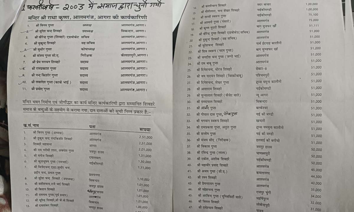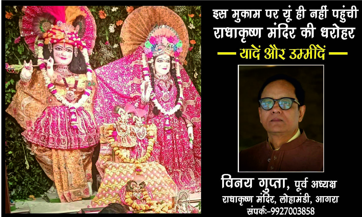 राधाकृष्ण मंदिर आगरा में शिवहरे समाज की ऐसी धरोहर है जो रातों-रात अस्तित्व में आई थी। लेकिन इस धरोहर के वर्तमान स्वरूप में आने की कहानी काफी संघर्षपूर्ण है। मेरे लिए सौभाग्य और गर्व की बात है कि इस संघर्ष में मैं भी शामिल रहा। वर्ष 2000 में मैं अपने परिवार और कारोबार के साथ फिरोजाबाद से आगरा शिफ्ट हुआ, मंदिर से लगे आलमगंज फाटक के अंदर अपने पुश्तैनी घर में। राधाकृष्ण मंदिर हर आगरावासी शिवहरेबंधु के लिए एक गौरवशाली धरोहर है, खासतौर से हम लोहामंडी के शिवहरे समाजबंधुओं के तो हृदय से लगी है। मेरी भी सुबह राधाकृष्ण मंदिर मे पूजा-अर्चना के साथ ही शुरू होती थी। उस वक्त मंदिर का स्वरूप याद आता है… टिनशेड में एक प्लेटफार्म था जिस पर राधाकृष्ण की प्रतिमा थी जिसकी पूजा होती थी। दुकानों के ऊपर एक हॉल था जहां समाज के मांगलिक कार्यक्रम होते थे। पिछली दीवार के पीछे एक बाड़ा जो मंदिर की ही संपत्ति थी जिसमें 8-9 शिवहरे परिवार वर्षों से किरायेदार थे। कुल मिलाकर प्रापर्टी ब़ड़ी थी, लेकिन मंदिर बहुत छोटा और अव्यवस्थित। यह देख मन में अक्सर विचार उठता कि समाज की इस धरोहर को उसका वो वैभव दिलाना होगा, जिसका सपना पूर्वजों ने देखा था।