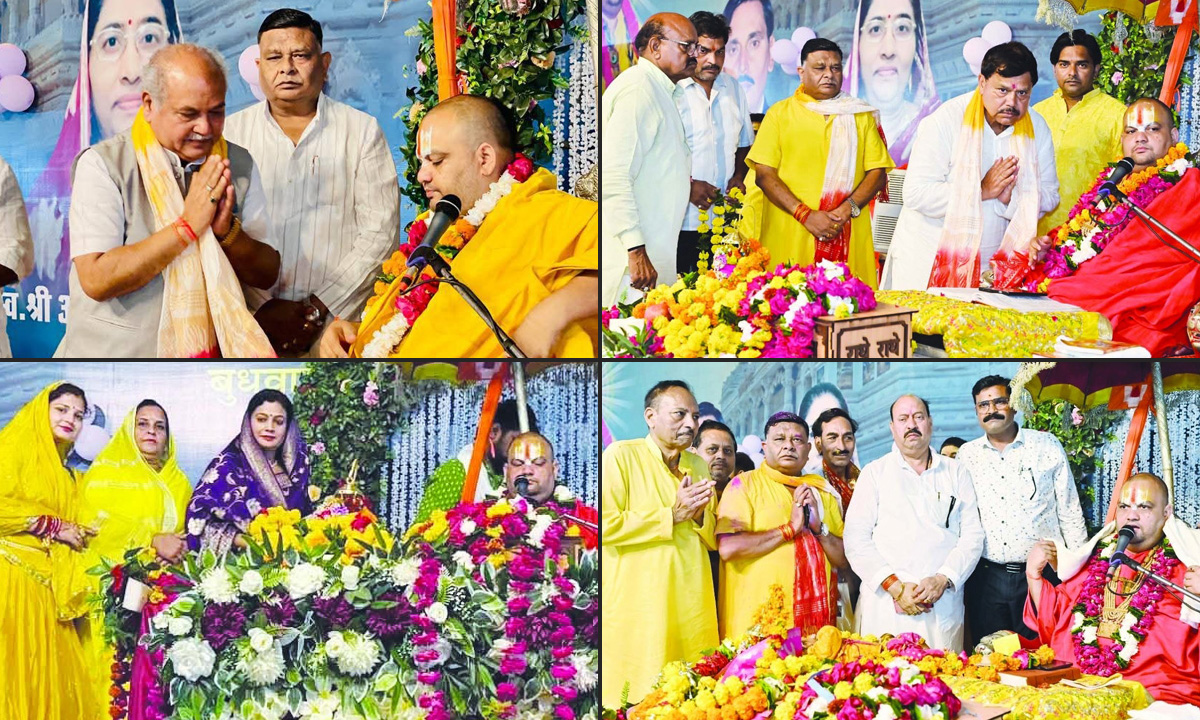 बता दें कि कथा का आयोजन ग्वालियर ङाईकोर्ट के प्रतिष्ठित अधिवक्ता श्री अनूप शिवहरे एडवोकेट परिवार की ओर से कराया गया है, जबकि परीक्षित की भूमिका में स्वयं उनकी पूज्य माताजी श्रीमती शकुंतला शिवहरे हैं। भागवत कथा के श्रवण से अपने जीवन और समाज को आनंदमयी एवं मंगलमयी बनाने के कल्याण-भाव से बड़ी संख्या में कलचुरी समाजबंधु नित जीवायएमसी प्रांगण में पधार रहे हैं। ग्वालियर की राजनीतिक, सामाजिक, कारोबारी जगत और प्रबुद्ध वर्ग की प्रतिष्ठित हस्तियां भी पहंच रही हैं। इसी क्रम में सोमवार को कथा के पांचवे दिन मध्य प्रदेश विधानसभा अध्यक्ष नरेंद्र सिंह तोमर ने कथा-श्रवण के आनंद के साथ भागवताचार्य के आशीर्वाद का दोहरा लाभ प्राप्त किया। पूर्व सांसद अशोक अर्गल. विधायक सतीश सिकरवार, पूर्व विधायक नीटू सिकरवार. पूर्व कांग्रेस अध्यक्ष सुनील शर्मा, प्रसिद्ध उद्योगपति लक्ष्मी नारायण शिवहरे, कलचुरी (कलार) महासभा ग्वालियर के अध्यक्ष सुरेशचंद्र शिवहरे, हिंदुस्तान एक्सप्रेस के मुख्य संपादक चंद्रप्रकाश शिवहरे समेत कई प्रतिष्ठित लोगों ने भी भागवताचार्य का आशीर्वाद प्राप्त किया।