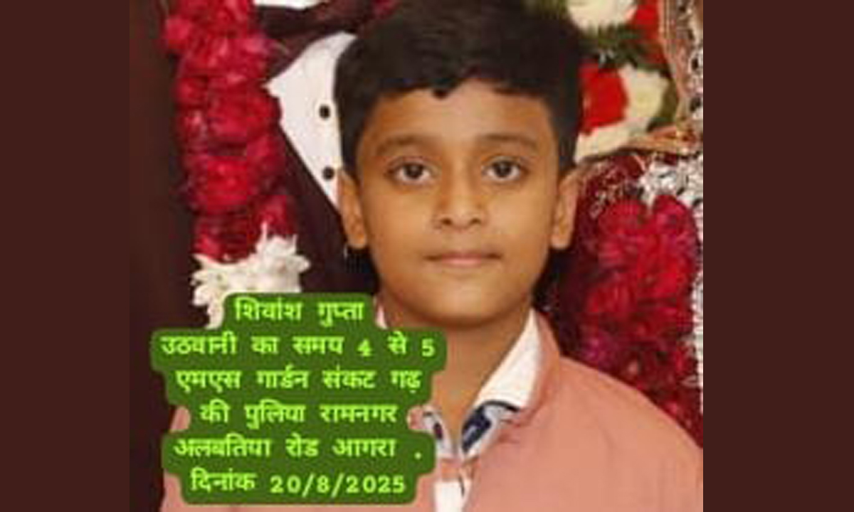आगरा में बालाजीपुरम (शाहगंज) निवासी श्री गौरव गुप्ता (शिवहरे) के 14 वर्षीय पुत्र शिवांश गुप्ता का बेहद दुखद परिस्थितियों में निधन हो गया है। वह ब्लड कैंसर की बीमारी से पीड़ित थे, तमाम उपचार के बावजूद जानलेवा बीमारी लास्ट स्टेज पर आ चुकी थी। बीते रोज दिल्ली के एक अस्पताल में उनका निधन हो गया। उनकी उठावनी आज बुधवार, दिनांक 20.08.2025 को शाम 4 से 5 बजे एमएस गार्डन (शंकरगढ़ की पुलिया, रामनगर-अलबतिया रोड, शाहंगंज, आगरा) में होगी।