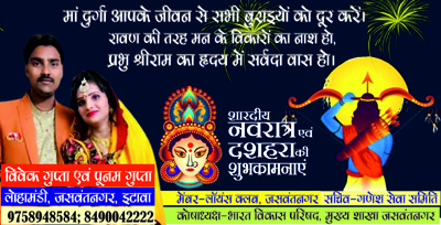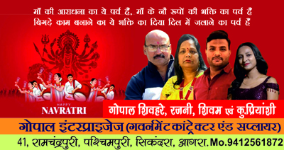 लोहामंडी की शिवहरे गली में स्थापित दुर्गा पंडाल गुरुवार देर रात तक देवी मां के सोलह श्रृंगार की दमक से जमगम रहा। पंडाल में मौजूद महिलाओं के चेहरे पर आस्था और श्रद्धा की चमक भी इससे कम नहीं थी। मां की आरती के बाद सभी श्रद्धालुओं ने प्रसादी ग्रहण की। शुक्रवार की शाम को पंडाल में रामलीला की प्रस्तुति की जाएगी। शिवहरे युवा कमेटी ने आगरा के सभी शिवहरे समाजबंधुओं से रामलीला में आकर भगवान राम की महिमा के मंचन का आनंद प्राप्त करने का आग्रह किया है।