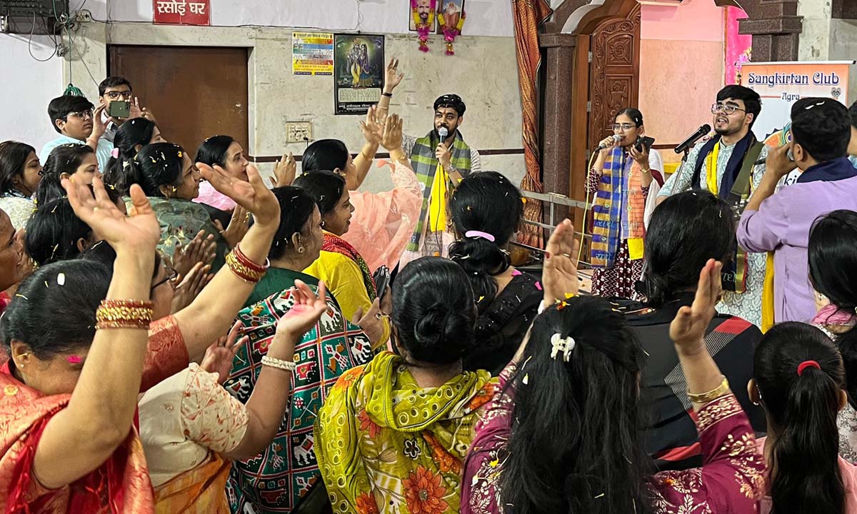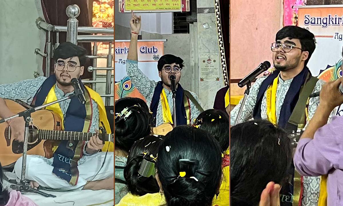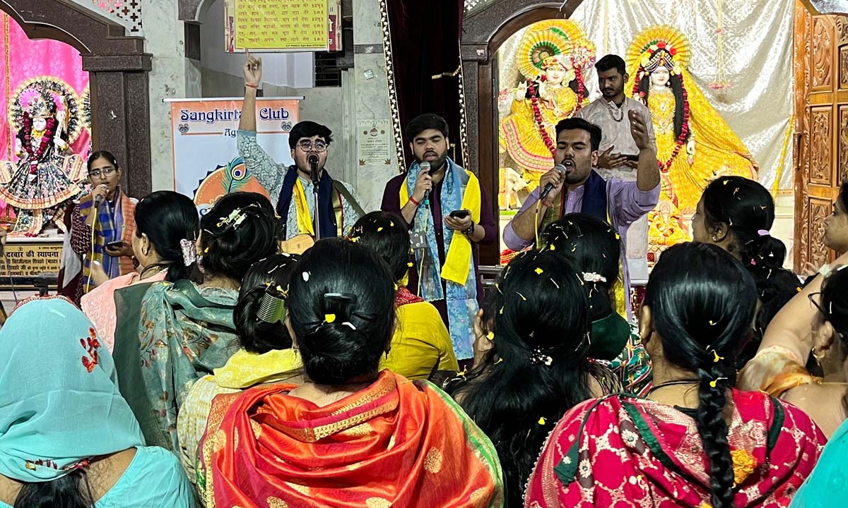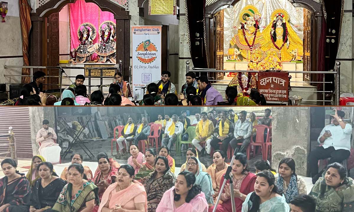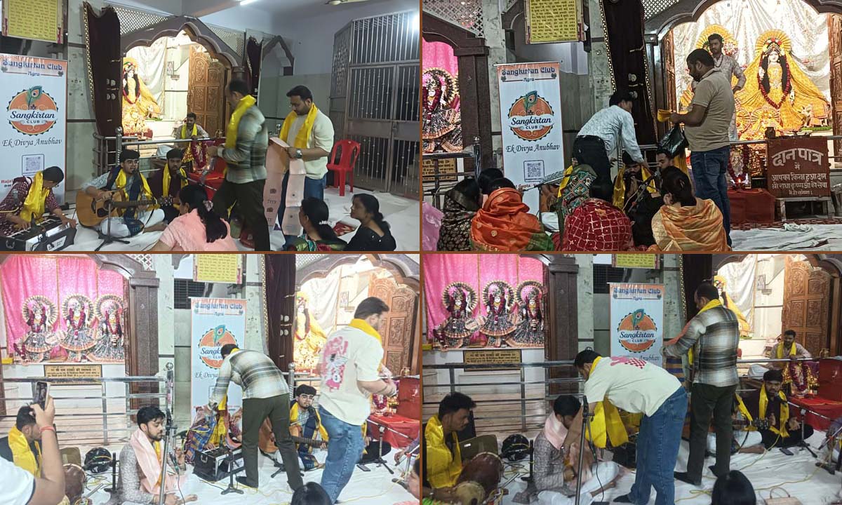 आगरा में शिवहरे समाज की धरोहर राधाकृष्ण मंदिर में गुरुवार को आयोजित ‘भजन संध्या’ में ‘संकीर्तन क्लब’ के कलाकारों ने ‘भजन-क्लबिंग’ के नए ट्रेंड से रू-ब-रू कराया। क्लब के मुख्य गायक यश गुप्ता ने अपने साथियों के साथ आधुनिक साजों की बीट्स-रिदिम में सुरबद्ध भजनों की प्रस्तुति से श्रोताओं के अंतर्मन को भक्ति और भाव के अलग-अलग रंगों से सराबोर कर दिया।