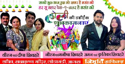 राधाकृष्ण मंदिर समिति के अध्यक्ष श्री अरविंद गुप्ता ने स्वजातीय युवाओं यश गुप्ता, श्यामजी शिवहरे, रजत गुप्ता और सोनू गुप्ता समेत समस्त कलाकारों को सुंदर प्रस्तुति के लिए बधाई देते हुए उन्हें समाज का गौरव बताया। उन्होंने कहा कि शिवहरे समाज के लिए यह गर्व की बात है कि हमारे प्रतिभावान बच्चों ने आगरा का पहला ‘भजन-क्लबिंग म्युजिकल ग्रुप’ बनाया है, समाज मे उनकी यह पहली प्रस्तुति हम सभी के लिए सुखद अनुभूति रही जो भविष्य की उनकी लंबी यात्रा की झलक देती है। इससे पूर्व राधाकृष्ण मंदिर समिति और शिवहरे युवा कमेटी की ओर से सभी कलाकारों एवं आगंतुकों का पटका पहनाकर स्वागत किया गया।