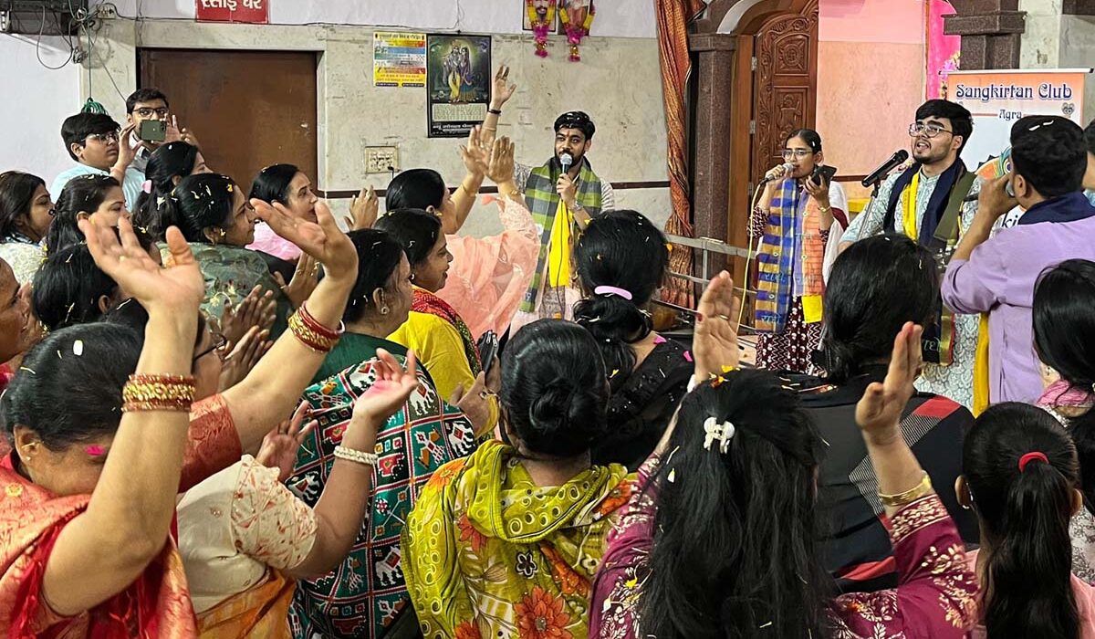 आगरा में शिवहरे समाज की धरोहर राधाकृष्ण मंदिर में गुरुवार को आयोजित ‘भजन संध्या’ में ‘संकीर्तन क्लब’ के कलाकारों ने ‘भजन-क्लबिंग’ के नए ट्रेंड से रू-ब-रू कराया। क्लब के मुख्य गायक यश गुप्ता ने अपने साथियों के साथ आधुनिक साजों की बीट्स-रिदिम में सुरबद्ध भजनों की प्रस्तुति से श्रोताओं के अंतर्मन को भक्ति और भाव के अलग-अलग रंगों से सराबोर कर दिया।