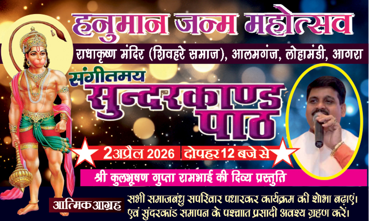 निर्धारित कार्यक्रम के अनुसार, 2 अप्रैल को दोपहर 12 बजे से हनुमान-भक्त ‘राम’ (श्री कुलभूषण गुप्ता रामभाई) अपने मधुर-कंठ से सुर-ताल में लयबद्ध सुंदरकांड की संगीमयी प्रस्तुति से रामभक्त हनुमान का गुणगान करेंगे, जिसके समापन के बाद दिव्य भोग-प्रसादी का वितरण होगा। कार्यक्रम आयोजक ‘राधाकृष्ण मंदिर प्रबंध समिति’ के अध्यक्ष श्री अऱविंद गुप्ता ने अपनी कार्यकारिणी की ओऱ से सभी शिवहरे समाजबंधुओं से कार्यक्रम में सपरिवार पधारकर सुंदरकांड का श्रवण कर बाबा की भोग-प्रसादी ग्रहण करने का आग्रह किया है।