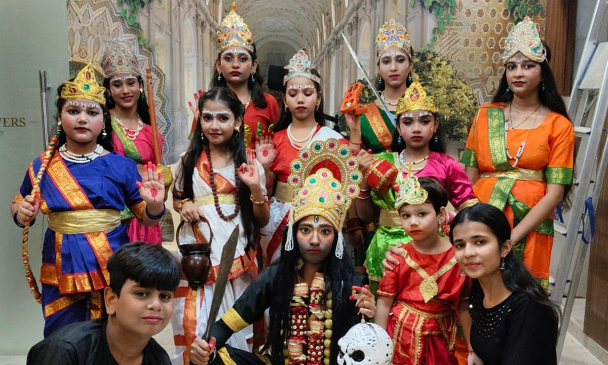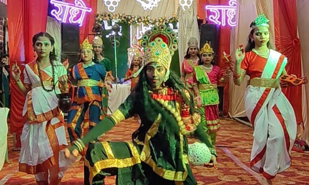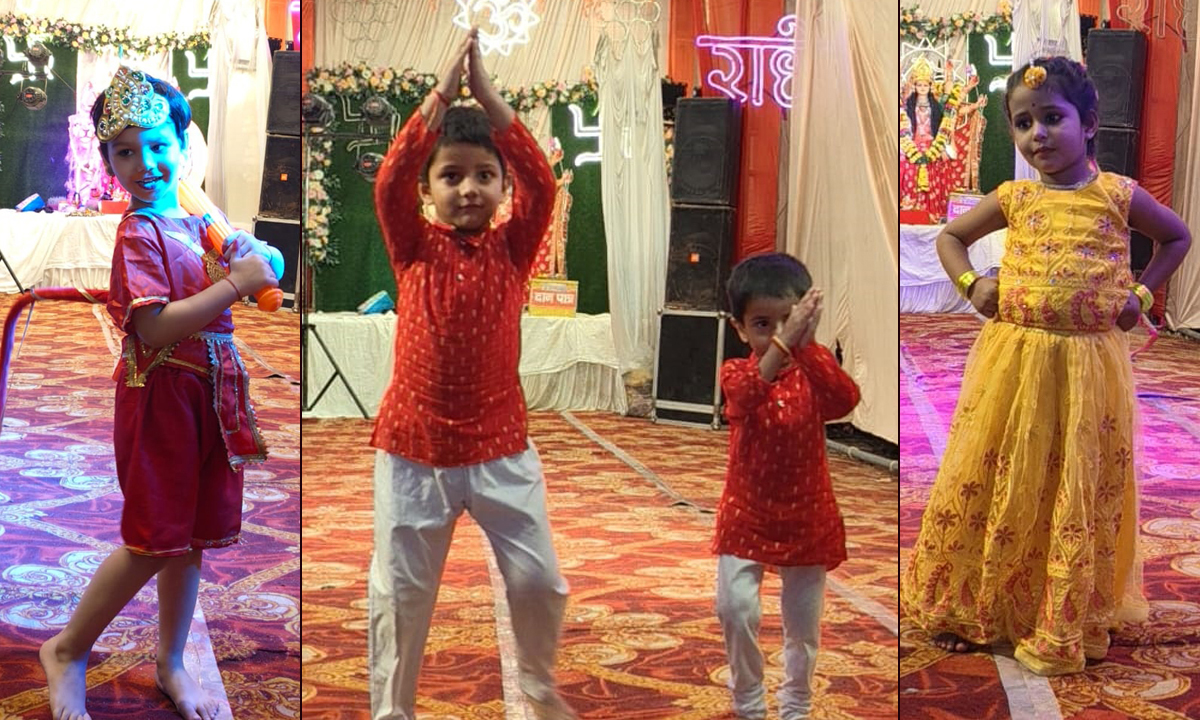 रात को आरती के बाद देवी मां का दरबार रोज की तरह क सांस्कृतिक मंच में तब्दील हो गया। छोटे-छोटे बच्चों ने देवी मां के नौ स्वरूप धारण किए, और उनसे जुड़ी पौराणिक कथाओं का मंचन नृत्य नाटिका के साथ किया। रसिका शिवहरे ने मां शैलपुत्री, सताक्षी ने मां ब्रह्मचारिणी, शुद्धी ने मां चंद्रघंटा, रिद्धि ने मां कुष्मांडा, पीहू ने मां स्कंदमाता, एजेल ने मां कात्यायनी, मिष्ठी ने मां सिद्धिदात्री, गौरी ने मां महागौरी और समृद्धि ने मां कालरात्रि का स्वरूप धारण किया। अथर्व गुप्ता ने राक्षस की भूमिका की। नृत्य की कोरियोग्राफी आशी गुप्ता और अग्रिम गुप्ता ने की। सुश्री पलक शिवहरे औऱ सुश्री मानसी शिवहरे ने सभी स्वरूपों को तैयार किया। इसके अलावा भी धर्म-संस्कृति से जुड़ी कई नृत्य प्रस्तुतियां हुईं जिसमें एलेक्स, गौरी, आरू, वेदांत, माधव, शिवा, रुद्र, लाडो, श्रान्या, नव्या, सारांश, सताक्षी, रसिका, शुद्धी, समृद्धि, अपूर्व और एंजेल ने अपनी प्रतिभा का प्रदर्शन किया।