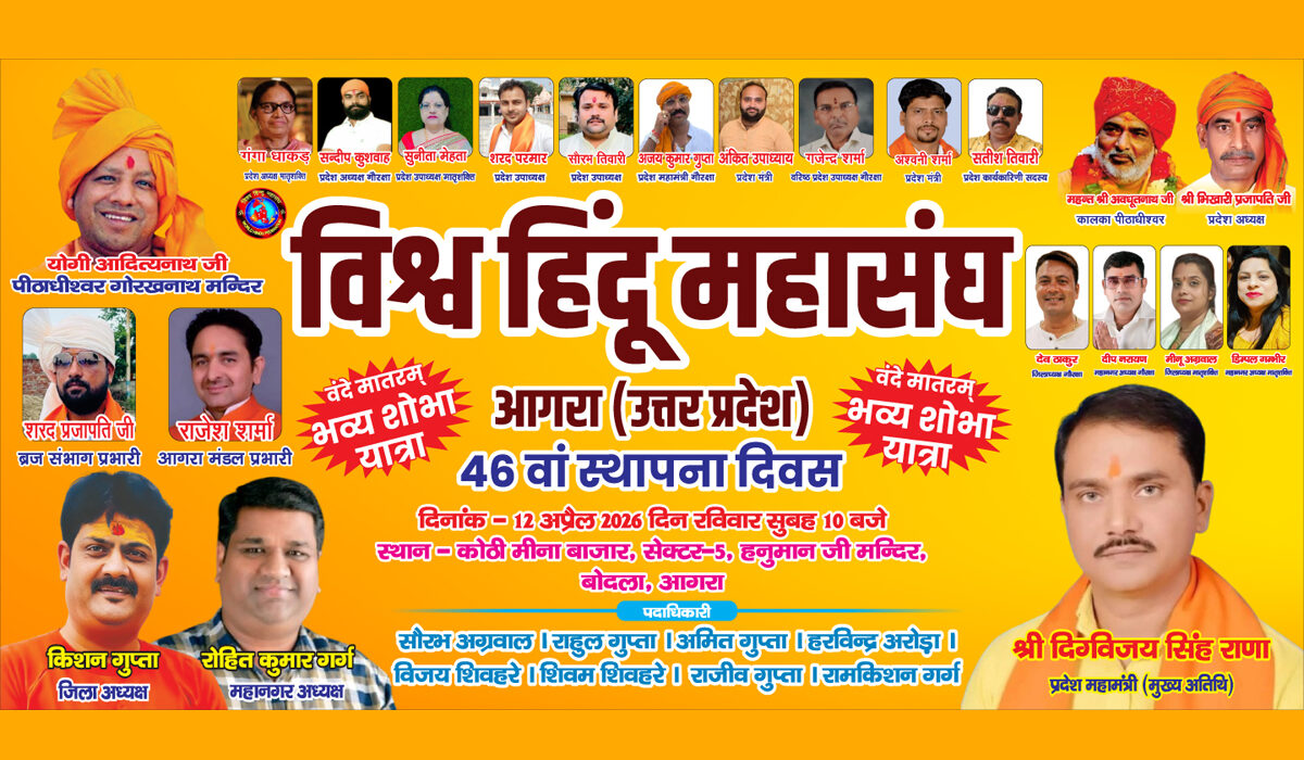 जातियों के भेद मिटाकर हिंदू समाज को एकजुट करने के लक्ष्य को समर्पित संगठन ‘विश्व हिंदू महासघ’ के 46वें स्थापना दिवस पर रविवार (12 अप्रैल) को आगरा में एत ‘भव्य वाहन रैली’ निकाली जाएगी। महासंघ के नवनियुक्त जिला अध्यक्ष श्री किशन गुप्ता (शिवहरे) के संयोजन में निकाली जा रही इस भव्य रैली में प्रदेशभर से लोग आ रहे हैं।