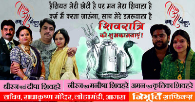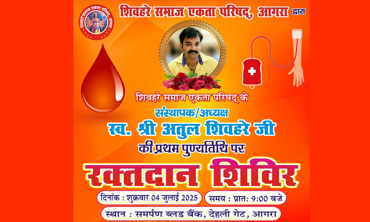 आगरा मे शिवहरे युवाओं के सामाजिक संगठन ‘शिवहरे समाज एकता परिषद’ आगामी 4 जुलाई को अपने संस्थापक-अध्यक्ष स्व. श्री अतुल शिवहरे की प्रथम पुण्यतिथि पर एक रक्तदान शिविर का आयोजन करने जा रहा है। दिल्ली गेट स्थित ‘समर्पण ब्लड बैंक’ यह रक्तदान शिविर सुबह 9 बजे से दोपहर 2 बजे तक चलेगा। विधायक श्री विजय शिवहरे इस शिविर का उदघाटन करेंगे।