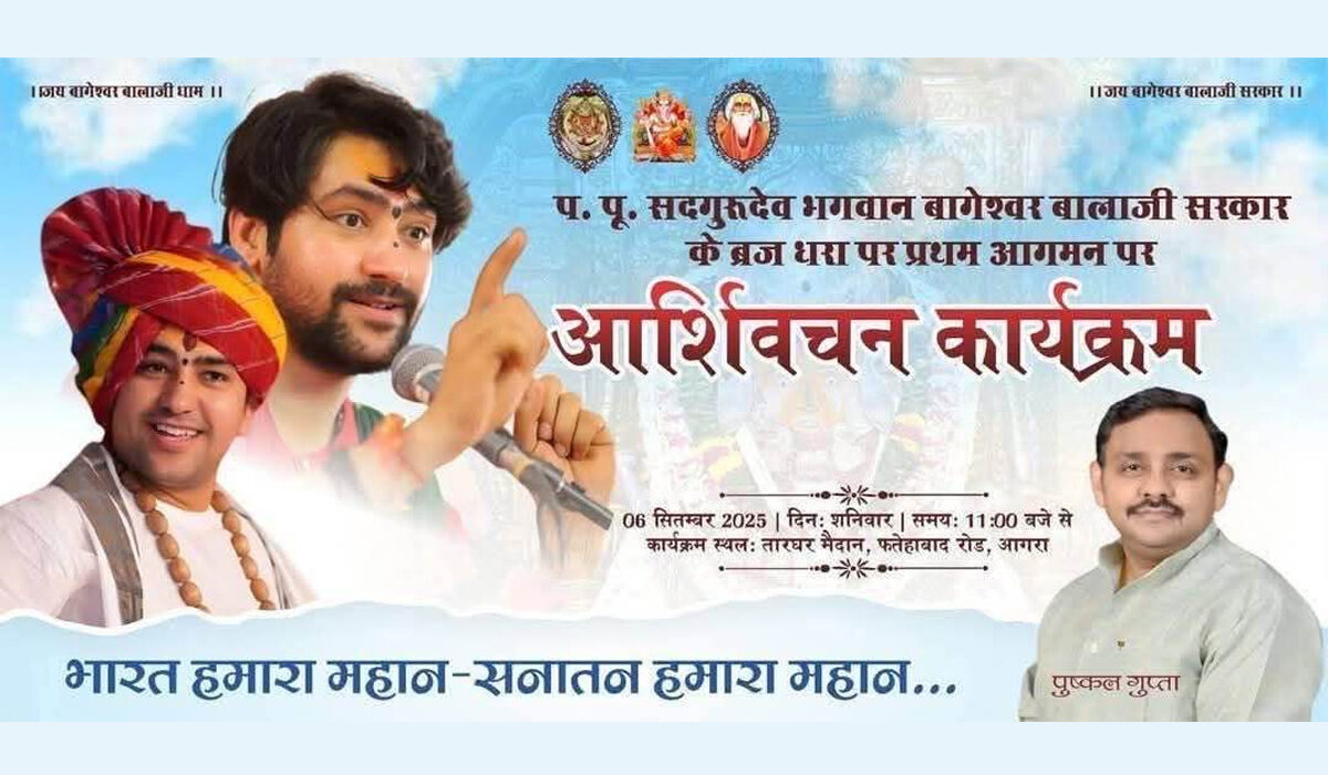 अपने बयानों और ‘पर्ची-सिस्टम’ को लेकर अक्सर चर्चाओं और विवादों में रहने वाले बाबा बागेश्वर धाम के पीठाधीश धीरेंद्र शास्त्री 6 सितंबर को पहली बार आगरा आ रहे हैं। तारघर मैदान में उनका ‘भारत हमारा महान-सनातन हमारा महान’ आशीर्वचन कार्यक्रम होगा जिसमें वह धर्म, भक्ति और राष्ट्रप्रेम पर अपना संदेश देंगे। 2 घंटे के इस कार्यक्रम के लिए भव्य व्यवस्थाएं की गई हैं।
